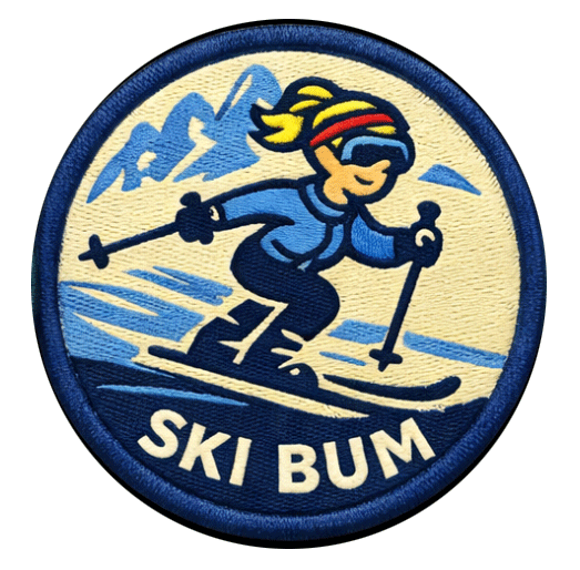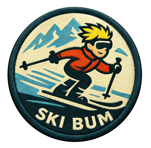 • Two young male skiers smiling and cheerfully holding a cup with the logo 'Ski Bum' on it, outdoors in a snowy mountain landscape with cars and buildings in the background.